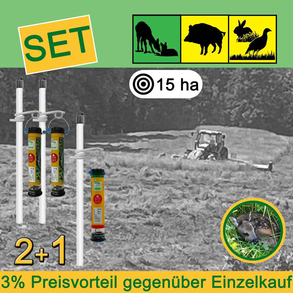 Professionelles Rehkitzrettungs‑Premium-Set mit zwei LS01 Rehkitzrettern und einem Wildretter PRO LS10. Intelligente optisch akustische Signale schützen Wildtiere zuverlässig vor der Mahd.
