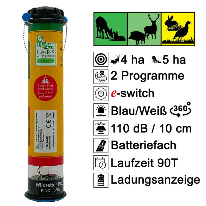 Bei der Wildvergrämung ist es wichtig, das Gerät, auch über mehrere Wochen problemlos einsetzen zu können. Dazu sind am Wildretter PRO LS10 keinerlei Vorbereitungen nötig. Die richtige Einstellung für den Einsatz als Wildvergrämer übernimmt die intelligente Programmsteuerung e – switch für Sie.