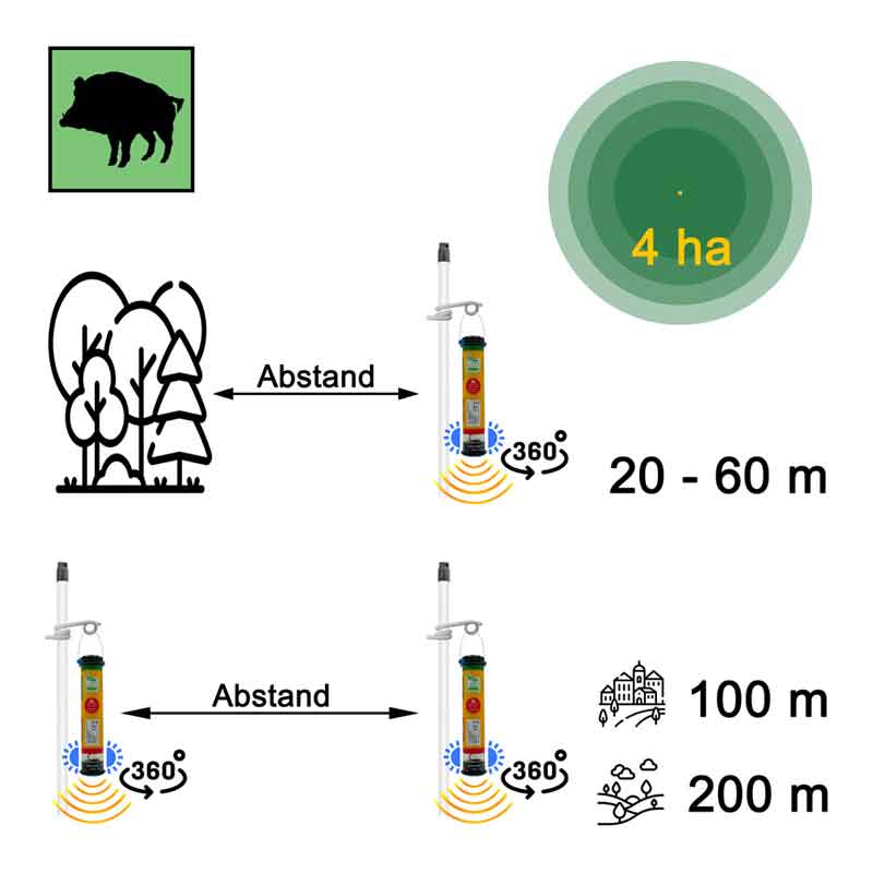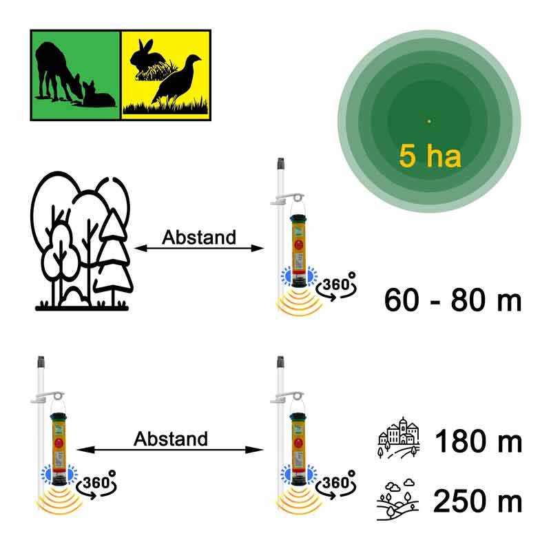 Die beste Wirkung bei der Wildvergrämung erzielen Sie bei einer Aufstellung von einem Wildvergrämer / Wildschreck pro 3-4 ha, dies entspricht einem Umkreis von ca. 100-115 Meter. Werden mehrere Geräte für eine Fläche benötigt, so sollte der Abstand zwischen diesen ca. 100–200 Meter betragen. Weiterführende Informationen finden Sie unter Informatives » Wildvergrämung.